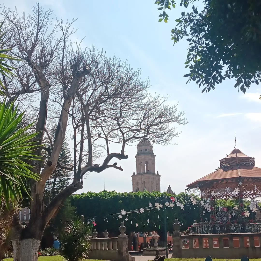 Atravesamos la calle y caminamos hacia el quiosco municipal, cuyas estructuras originales de madera fueron reemplazadas por piezas cortadas con técnica láser, y que, para las fiestas decembrinas, ha sido decorado con letras de neón de Coca-Cola.