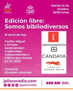 Cada martes, el 630 de AM se llena de voces, libros e ideas con Edición Libre: somos bibliodiversos, el programa de radio dedicado al mundo editorial independiente que se transmite por Jalisco Radio. Producido por las editoriales Arlequín y Página Seis, este espacio abre un diálogo vivo sobre el libro como territorio cultural, político y creativo.